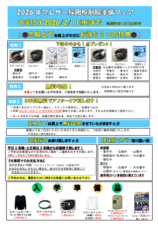 ご自宅に無料宅配いたします!(冬服上下お買い上げの方、支払い時に限ります)