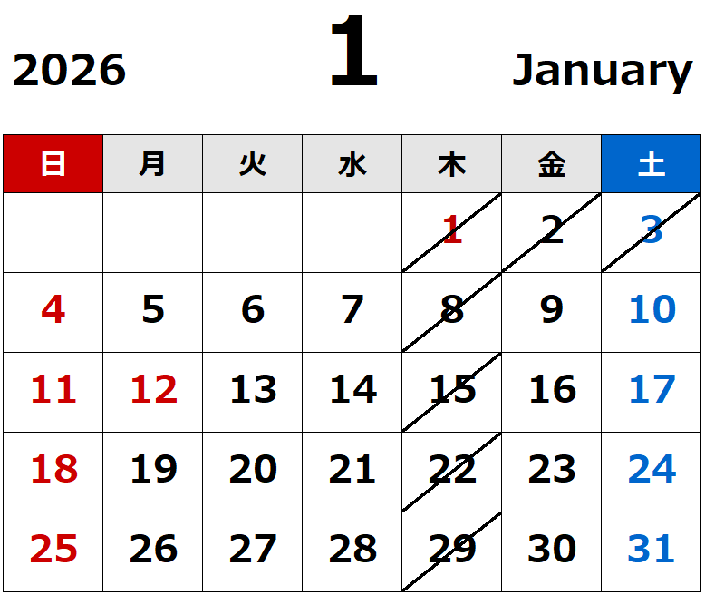令和8年の年始の営業は4日(日)からの営業でございます。また毎週木曜日にお休み頂いておりますので、ご確認お願い致します。